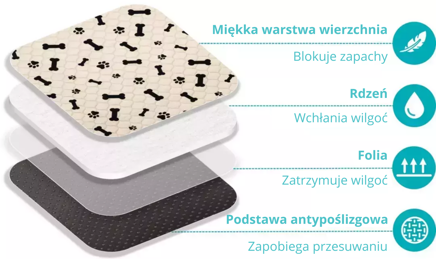 Unikalna konstrukcja PiesioPada składa się z wielu warstw, które współpracują, aby zapobiegać przeciekaniu i zatrzymywać nieprzyjemne zapachy. Dzięki miękkości, wygodzie i charakterystycznemu wzorowi Twój pies z przyjemnością będzie z niej korzystał.